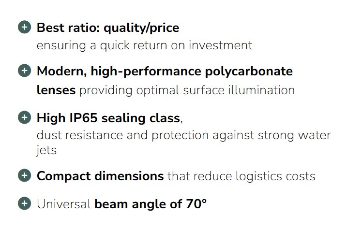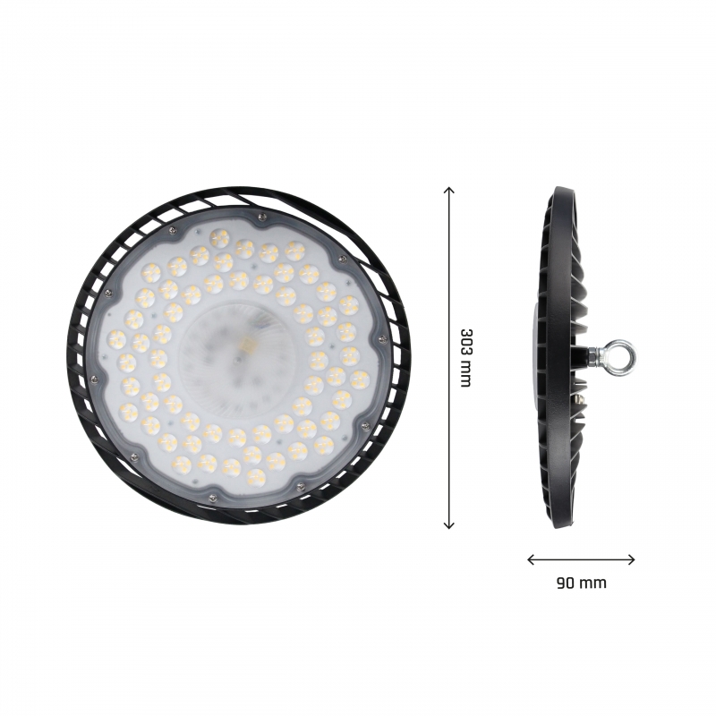 High bay luminaire PLATEO SUN 4, with a power of 205 W, high light efficacy 110 lm/W. It has a very high degree of protection IP65, providing protection against the ingress of dust and water jets. It shines with light of neutral - the most universal colour (4000K). Narrow beam angle 70° gives directional light so that selected surfaces can be better exposed. Designed for suspended mounting.