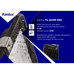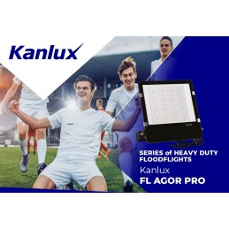 Kanlux AGOR PRO floodlights are a modern and durable lighting solution, ideal for areas such as sports facilities, production halls or facades of industrial or warehouse buildings. They are available in three power ratings: 100W, 150W and 200W and in symmetrical (140 lm/W) and asymmetrical (135 lm/W) versions. Thanks to the IP65 tightness class and IK08 durability, they effectively resist external factors. Solid construction made of cast aluminum, reinforced radiator and angle adjustment up to 270° ensure long life and versatility. They operate in 4000K color and are covered by a 5-year warranty